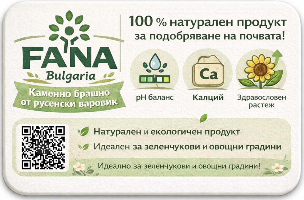 Варовиковото брашно FANA е много фин прах от естествен камък – русенски варовик, който се добавя в почвата за да я „подобри“. Каменното брашно FANA е фино смляна варовикова фракция с едрина от 1 до 100 микрона, т.е. колкото човешки косъм. FANA намалява киселинността на почвата (повишава pH) и добавя калций, важен химически елемент, в почвата а от там и в растенията.